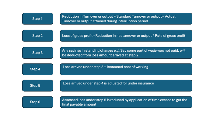 - Loss of gross profit (i.e. Reduction in turnover / output / revenue * Rate of gross profit). This will include the standing charges or fixed costs which the corporate continue to pay when the factory is shut (i.e. rent, depreciation, salary, electricity charges, part wages, interest etc.).